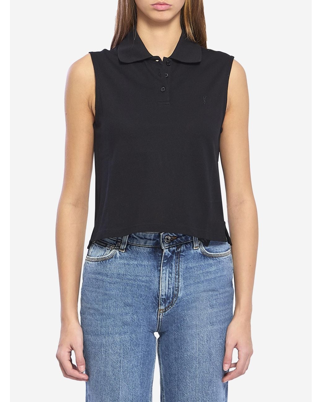 Black sleeveless polo in cotton piqué. Featuring a pointed collar, three-button front polo closure, side slits at the hem, tonal Cassandre embroidery on the chest, and a longer back. Regular fit. Colour: blue