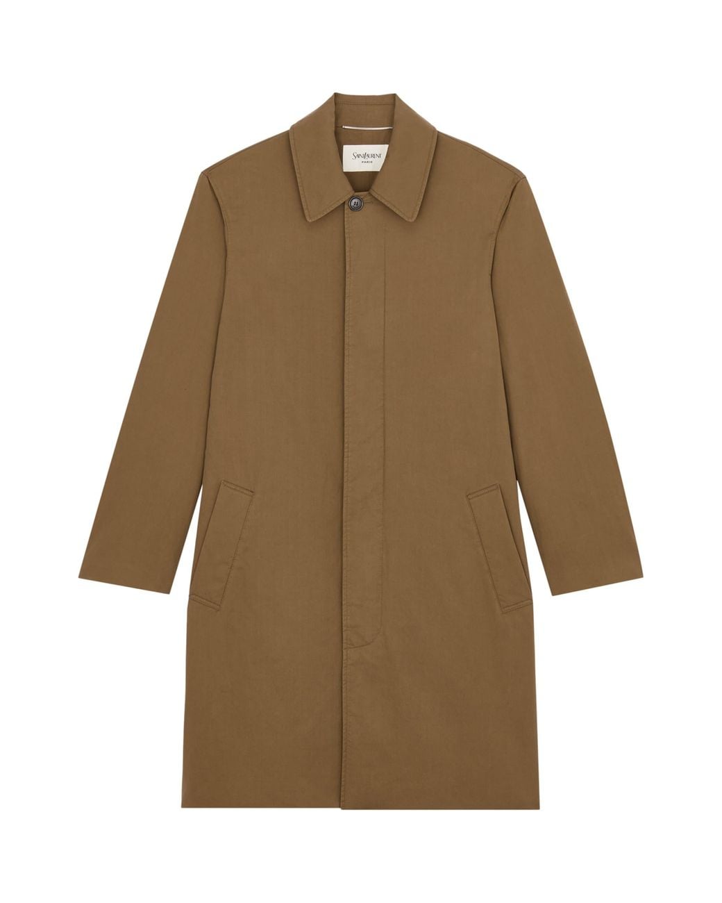 Saint Laurent reinterprets the trench coat with this minimal cotton version, paying subtle homage to a garment that has been a symbol of both utility and elegance since its military origins in the early 20th century. Clean lines and concealed buttons keep the silhouette pared-back and refined, allowing the structure and proportion to take centre stage, resulting Colour: brown