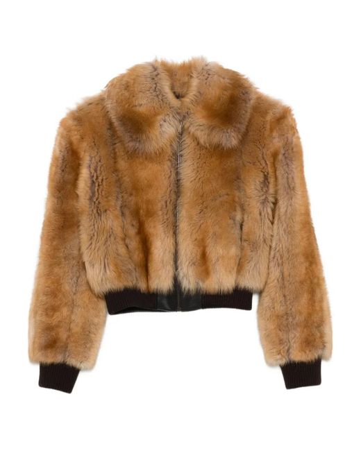 Women's Brown Leather-Trimmed Shearling Bomber Jacket