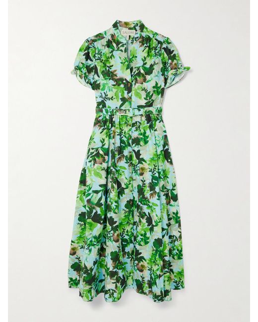 Women's Green Ena Belted Printed Cotton Midi Dress