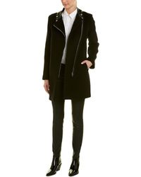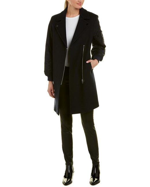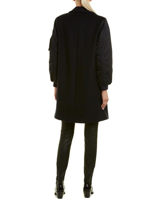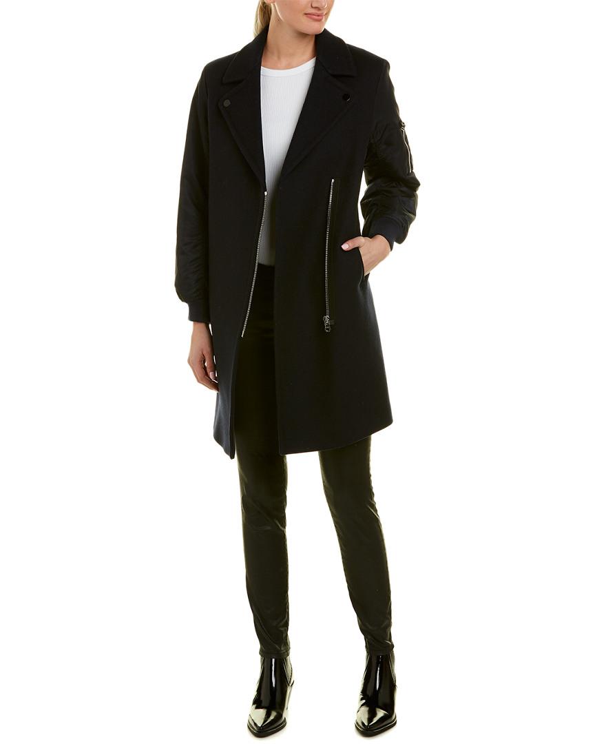 Please note: Size selections are European. For US conversions, please reference the size chart. Color/pattern: navy blue. Approximately 35.5in from shoulder to hem. Measurement was taken from a size 36 and may vary slightly by size. Design details: notched lapel, two front pockets, contrast sleeves with zippered pocket, rib-knit cuffs. Asymmetrical zip closure. Medium weight. Body: 80% wool, 20% polyamide. Sleeve: 100% polyamide. Padding: 100% polyester. Rib: 84% cotton, 14% polyamide, 2% elastane. Dry clean only. Colour: blue