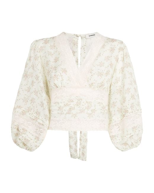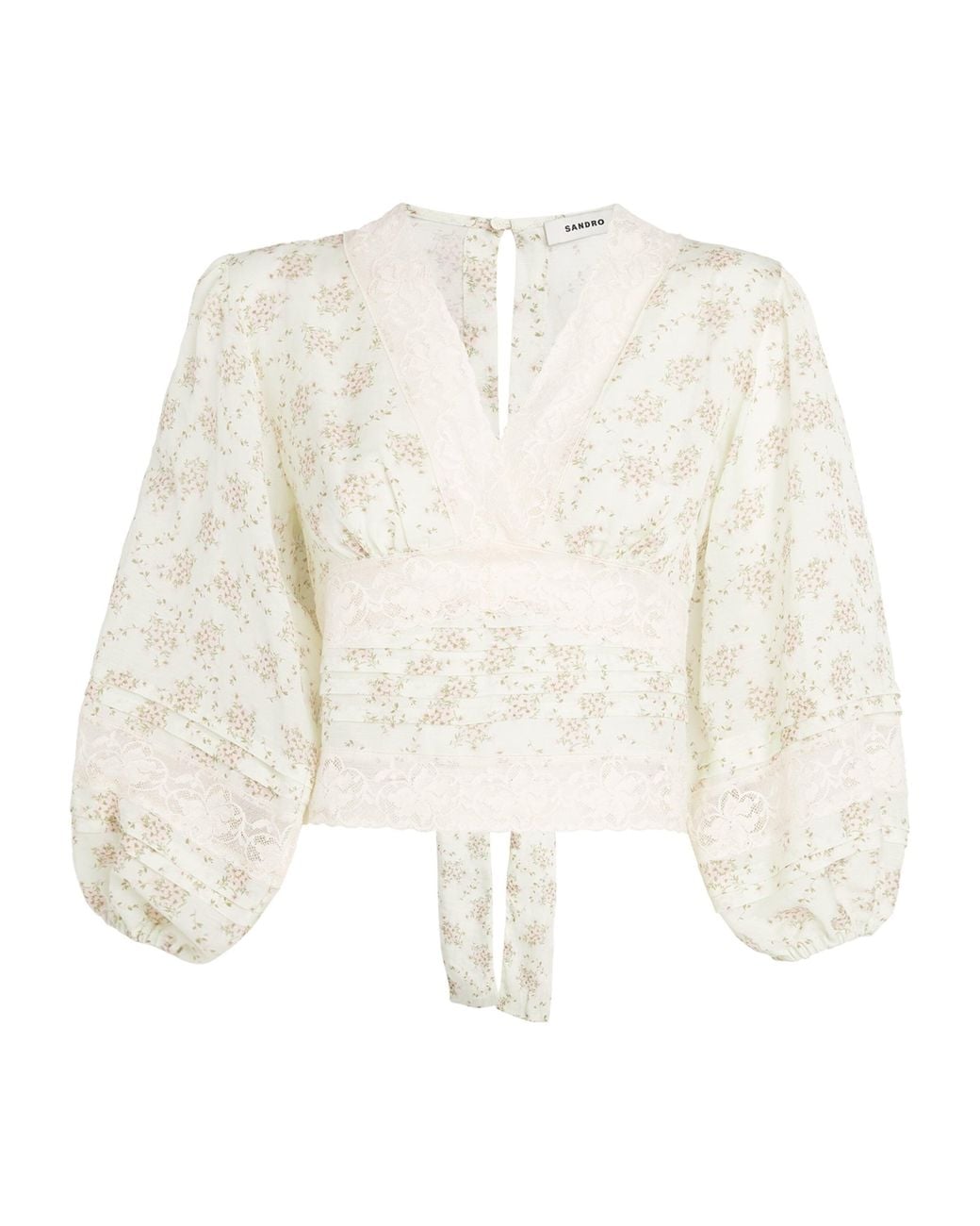 Achieve Sandro’s Parisian brand of feminine cool in this pretty blouse. It combines a ditsy floral print with lace panels, blouson sleeves and V neckline, while a peek at the reverse reveals a keyhole back with a tie-fastened waist. Team with the matching skirt for a floral-on-floral ensemble. Colour: white