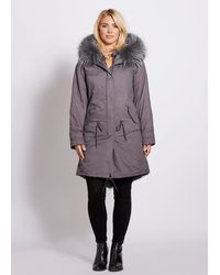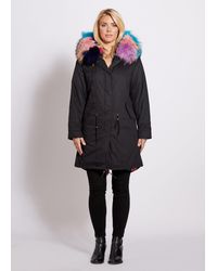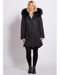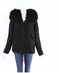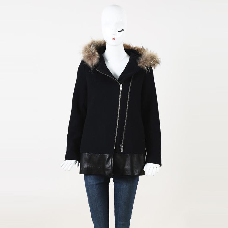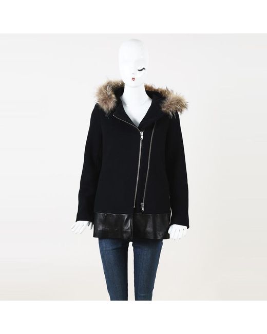 Sandro wool blend coat features leather accents, raccoon fur trimmed hood, pockets, and a front zip closure. Lined. Wool/Nylon/Polyamide/Leather/Fur/other:Raccoon Fur. Colour: black