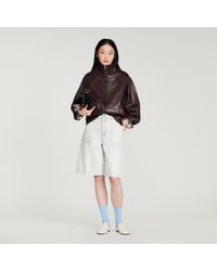 Go to FARFETCHChocolate brown calf leather pebbled texture oversized pointed collar long raglan sleeves with elasticated cuffs two front press-stud welt pockets elasticated hem logo-jacquard lining front zip fastening Size: 34. Gender: Female. Material:Calf Leather. Colour: brown