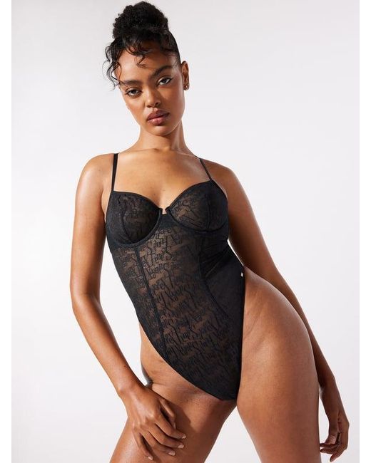 Underwire Logo-design lace Mesh trim at cup neckline Back keyhole cutout Adjustable and supportive plush-back straps Ultra high-leg thong at back body Metal logo plate on left hip Hook-and-eye back closure Lace: 63% Polyamide, 37% Elastane; Lining: 100% Polyamide, Gusset: 100% Cotton Hand wash cold water, line dry Imported. Colour: black