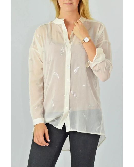 Women's Natural Pleated Collar Feather Print Long Line Tunic
