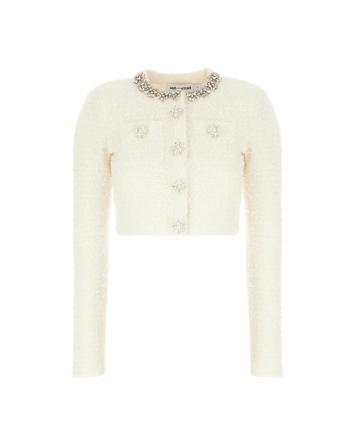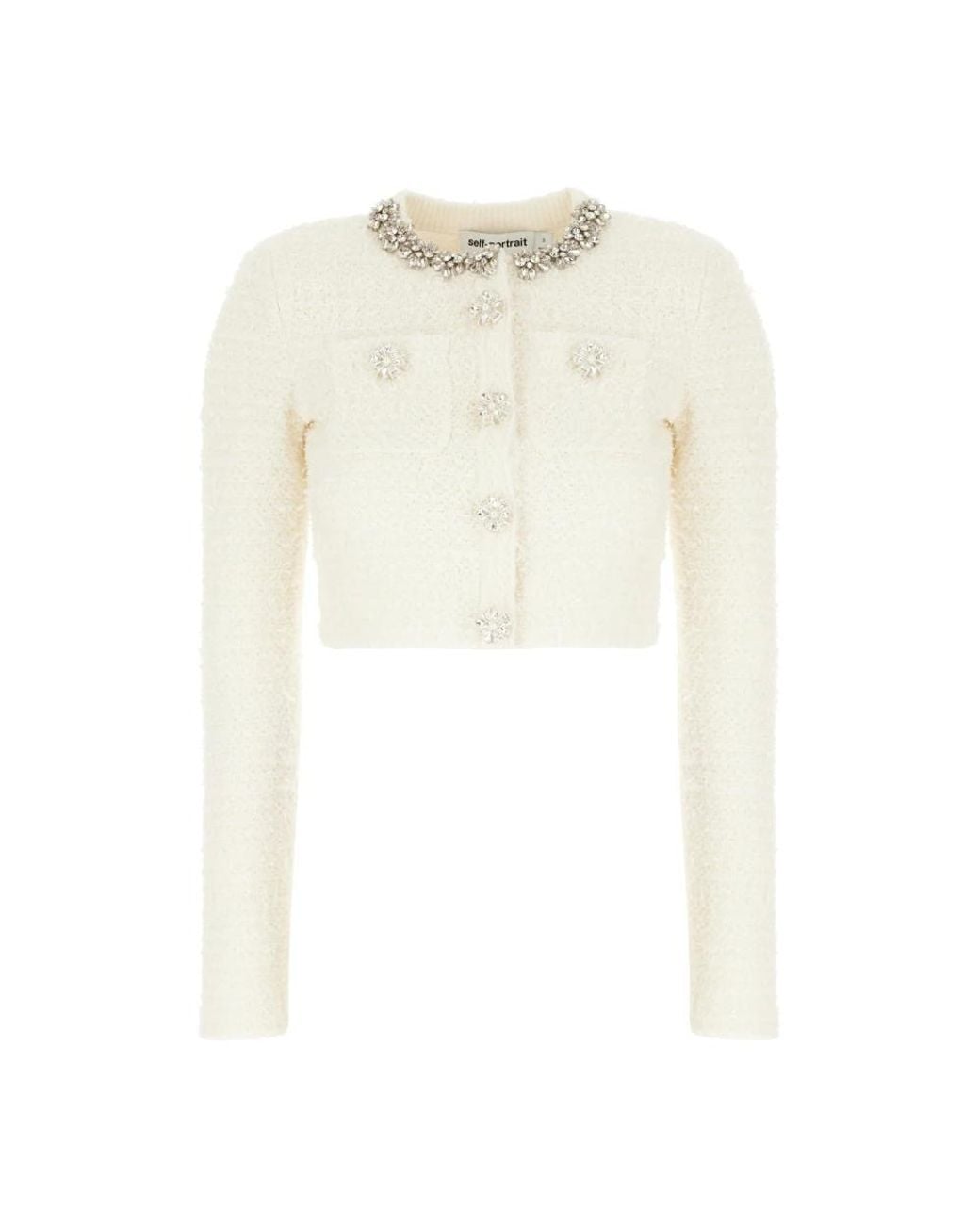 Self Portrait Textured Knit Cardigan is a cropped bouclé knit featuring a crystal-embellished collar and jewel buttons. It offers a polished, occasion-ready layer that pairs well with skirts or tailored separates. Key attributes: Beige | Cream | Bouclé knit | Front snap button closure | Functional pockets | Cropped silhouette | Crew / round neckline | Crystal-embellished collar | Jewel buttons | Bouclé texture | Dimensions & fit: Regular fit | Composition & care: 41% cotton | 30% polyester | 15% polyamide | 13% wool | 1% elastane