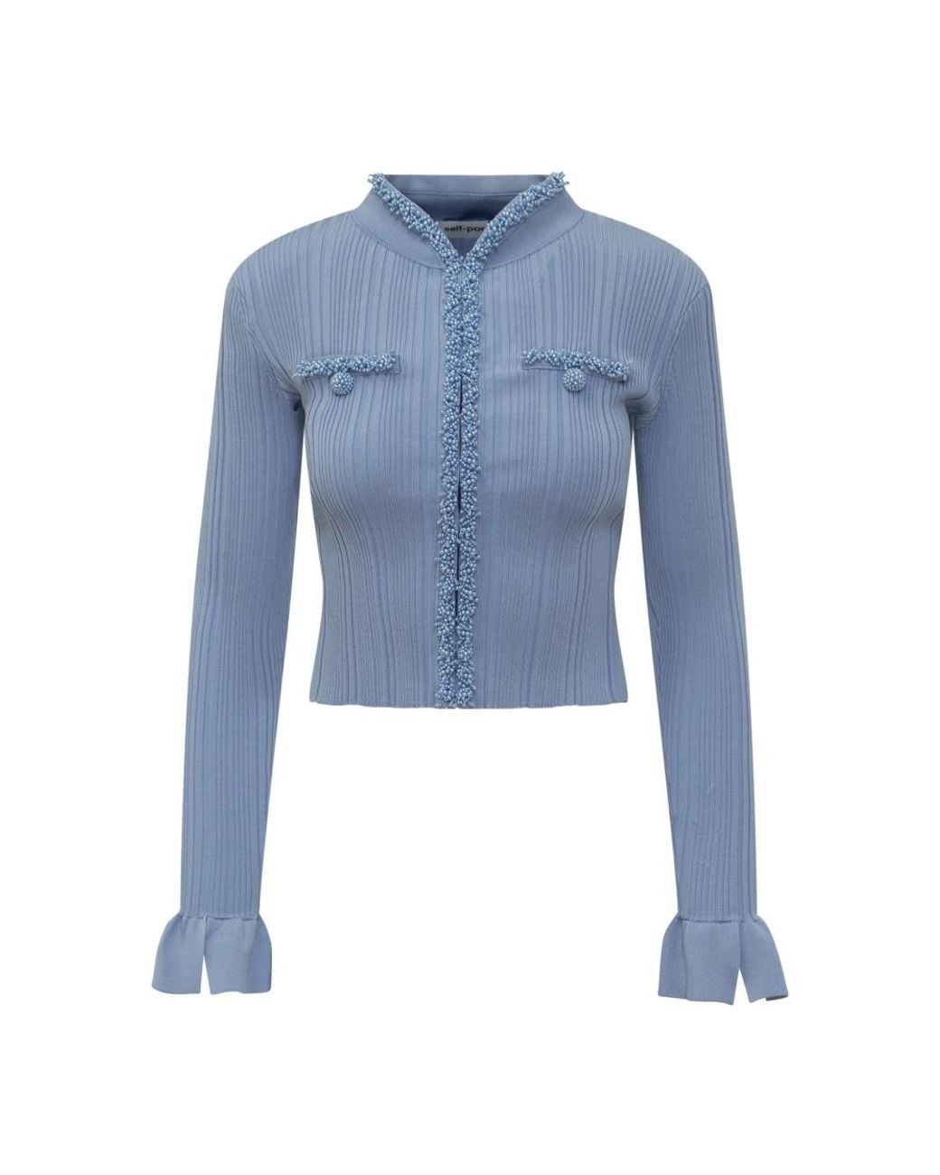 Self-Portrait Pearl Cardigan: a ribbed knit finished with pearl-embellished trims and textured detailing, designed as a cropped layer for polished day-to-night styling. Key attributes: Light blue | Viscose | Refined pocket details | Ribbed knit | Pearl-embellished trims | Textured finish | Cropped silhouette | Dimensions & fit: Cropped silhouette | Composition & care: 50% Viscose | 32% Polyester | 16% Nylon | 2% Elastane | Refer to manufacturer's instructions. Colour: blue