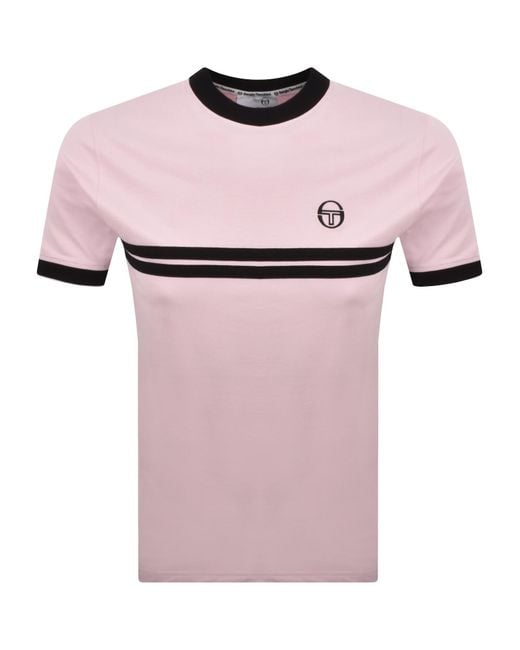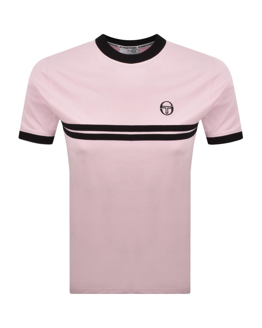Sergio Tacchini Supermac T Shirt In Light Lilac. A ribbed crew neckline and ribbed cuffs on the short sleeves both in black. Two woven stripe details are situated across the chest and the signature Sergio Tacchini logo is embroidered on the left of the chest both in black. 100% Cotton. Colour: pink