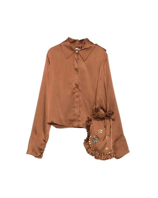 Brown satin texture long sleeves button fastening detachable mini-pouch Colour: brown