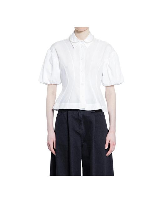 Elevate your wardrobe with this white cotton poplin blouse from Simone Rocha. Featuring a darted corset construction, classic collar with faux pearl trim, button closure, dropped shoulders, short puff sleeves, cropped hem, and a boxy fit. Model is 180 cm tall, with chest 82 cm, waist 58 cm, and hips 90 cm. Colour: white