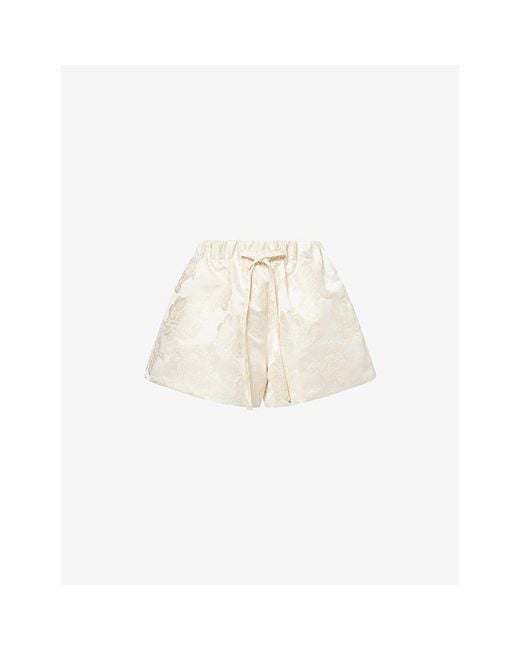 Simone Rocha satin shorts100% polyester; lining 100% cuproRegular fit, elasticated drawstring waistband, slip pockets at sides, all-over rose print jacquardDry cleanMade in PortugalTrue to sizeModel is 5ft 10in/1.78m and wears a size UK 8Lightweight, non-stretch Colour: white