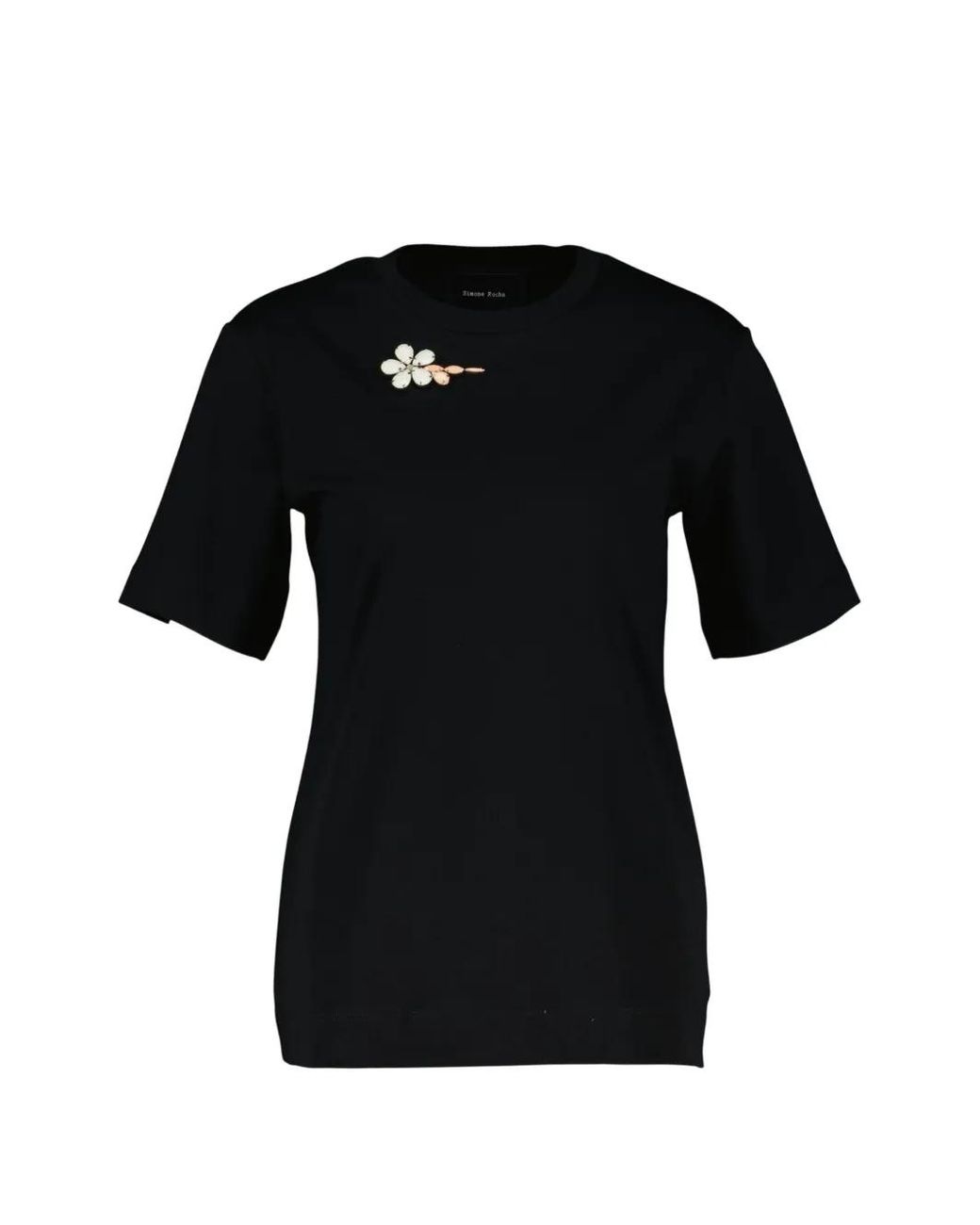 Women's Black Short-Sleeved Flower-Detail T-Shirt
