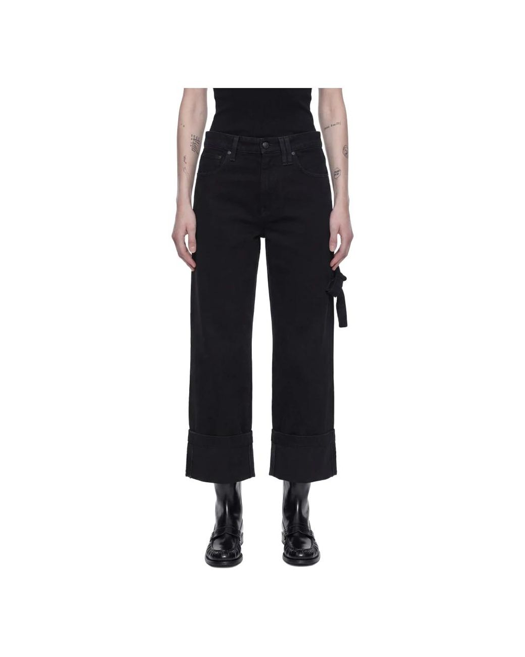 Simone Rocha Cropped Straight Leg Jeans rework classic denim with wide legs and signature details — a crystal-embellished leather patch and a back bow — for a sculptural, statement-ready everyday pant. Key attributes: Black | Woven cotton | Belt holes | Zip and button closure | Five pockets | Wide straight leg | Cropped turn-up hem | Back leather patch with crystal embellishment | Back bow detail | Dimensions & fit: Mid-rise | Cropped fit | Wide straight leg | Composition & care: 100% cotton | Patch: 100% leather (excl. embellishment) Colour: blue