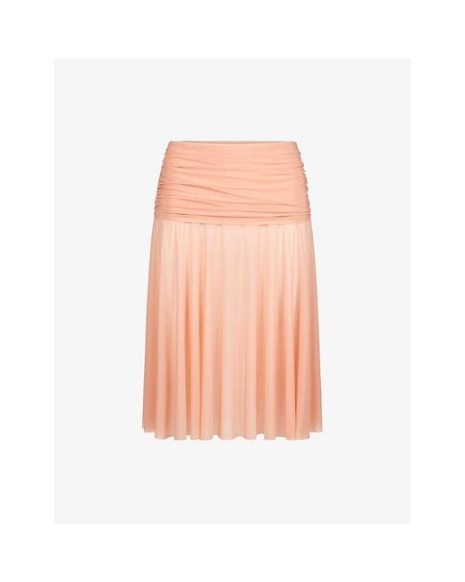 SKIMS jersey midi skirt56% polyamide, 44% elastaneRegular fit, mid-rise, elasticated waistband, fixed fold-over waist with ruching, A-line shape, flared, raw hemHand washTrue to sizeModel is 5ft 10in/1.78m and wears a size smallLightweight, stretchy Colour: pink