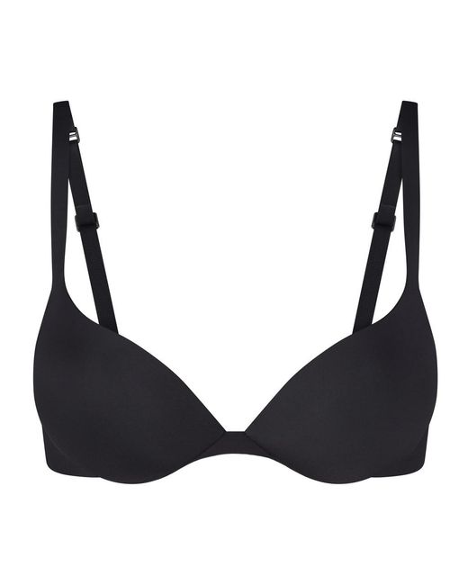 Style Notes The Ultimate Bra redefines traditional push-up bras by enhancing your natural bust shape and completely transforming the look, shape, and fullness of your bust. This bra is made of a super soft sheen microfibre fabric with extra compressive side wings for smoothing. With a comfortable, concealed underwire and premium teardrop shaped foam pads, this bra sits seamlessly under clothing. Info & Care Skims push-up bra Part of the Ultimate collection Soft foam push-up pads for seamless look, lightweight, plunge neckline, concealed underwire with a soft brushed casing, elasticated adjustable straps Hook and eye closure at back 84% nylon, 16% elastane Hand wash cold Size & Fit Designed for a snug fit Colour: black