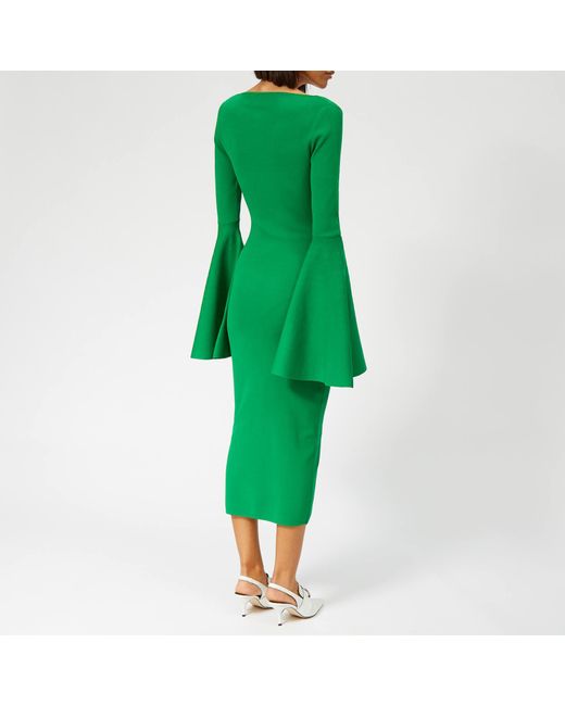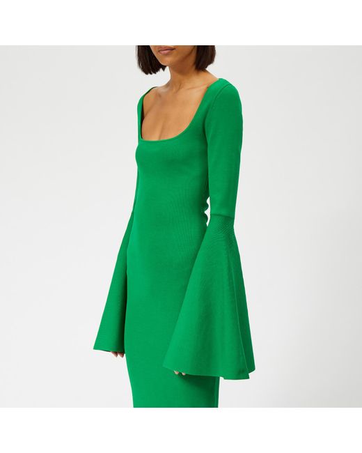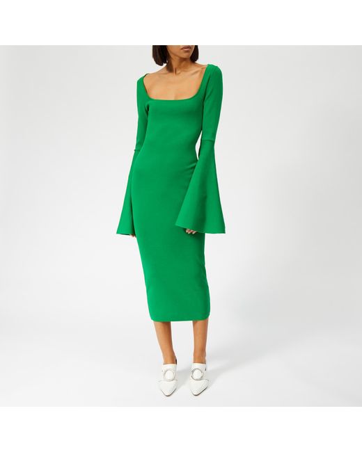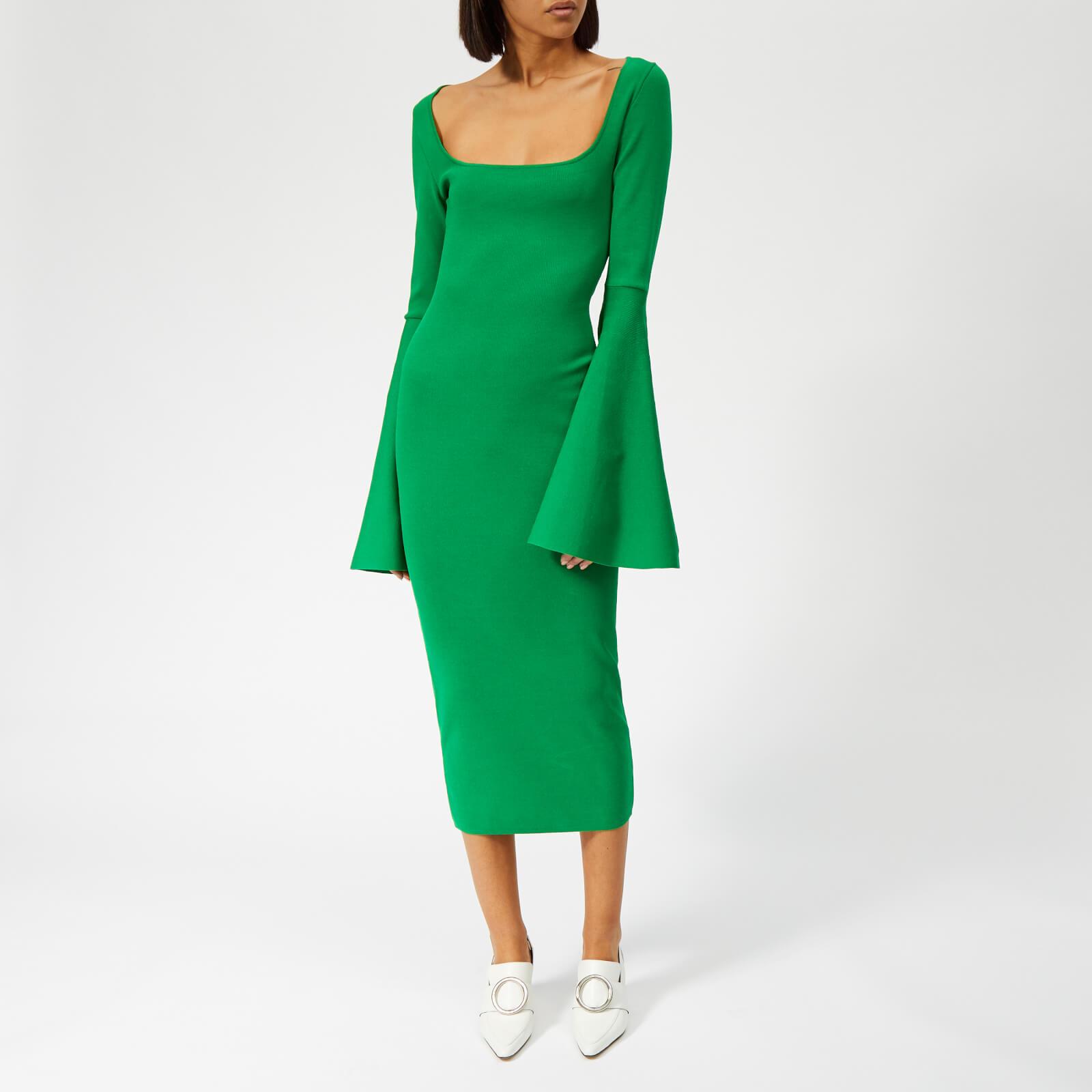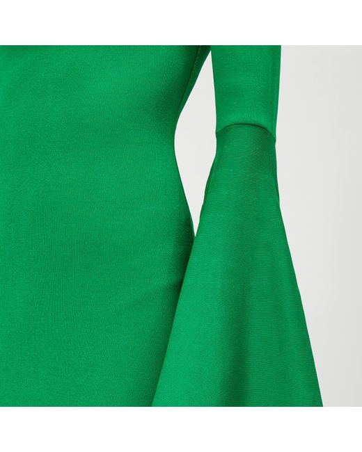 Solace London creates statement pieces defined by precision cuts and sophistication. The 'Serra' midi dress, in a striking green hue, is formed from heavy stretch knit fabric to sculpt the frame and features an extreme square neckline and exaggerated bell sleeves. The bodycon dress is free from zips to maintain a clean silhouette. 56% Viscose, 42% Polyamide, 2% ElastaneModel is 174cm/5'8.5 and wears a size UK 8. Colour: green
