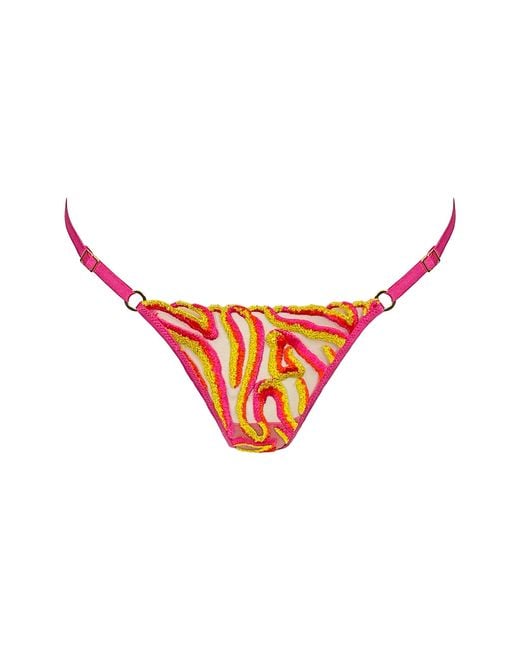 If tigers were hot pink and glittering, they’d look a lot like this. Cut super low at the front with a high leg and soft adjustable sides, this keyhole string is embroidered in vivid satin stitches and shimmering lurex on sheer taupe tulle. Handmade in Brooklyn, NY, it’s designed to sit high on your hips and spark a little extra attitude—whether anyone sees it or not. Composition: Embroidery / Tulle base: 100% Polyester Elastic: Nylon/Spandex Components: Zinc Alloy Care Instructions: Somewhere Never lingerie needs a little more TLC than your everyday knickers. The embroidery is made up of long luxurious satin stitches, which are very delicate, so please be careful not to catch the threads on your nails, zippers or any other sharp or pointy things. Gently wash your new lingerie by hand with similar colours, in cool water with a mild detergent - always avoid the use of bleach or chemical soaps to maintain fabrics and colours. Please don’t rub, wring or soak. Once washed, dry flat in the shade. Colour: red