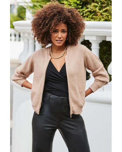 50% cardi, 50% bomber, 100% cosyChic collarless necklineSpun from the softest taupe knit Elegant blouson sleeve silhouette Classic zip fastening From jeans to cargos, it'll go with all your trousers Colour: natural