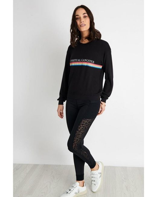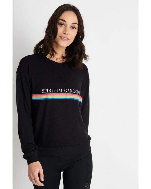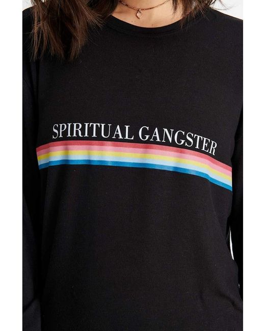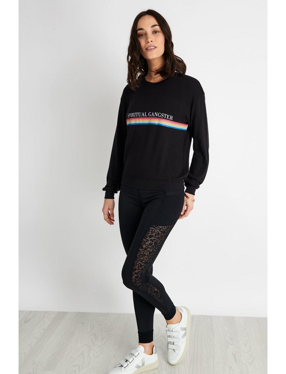 Spiritual Gangster SG Rainbow Neck Savasana Sweater in Black. 47% poly 47% rayon 6% spandex. Front screen print graphic. Made in USA. Spiritual Gangster is a movement designed to join ancient wisdom with modern culture. Inspired by yogis, athletes, artists and musicians worldwide, we create collections to encourage the high vibration practices of living in gratitude, giving back and choosing happiness. Our mission is to inspire positivity, generosity, kindness and connectedness with this goal in mind: May All Beings Everywhere Be Happy and Free.