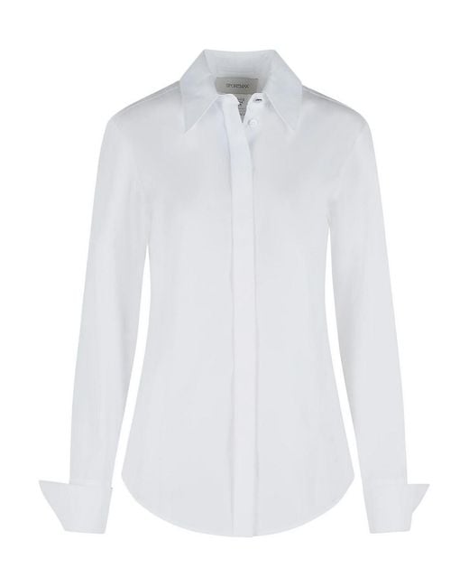 Pointed collar, concealed button closure, single-button cuffs, round hem, and silhouette that tightens at the waist Colour: white