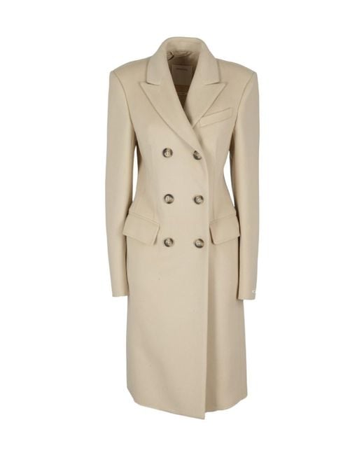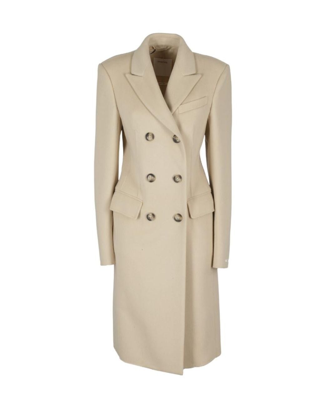 Double-breasted lapel coat, trapezoidal lapel, double-breasted front, chest and side pockets, buttons decorated cuffs, rear centre slit detail. Colour: natural