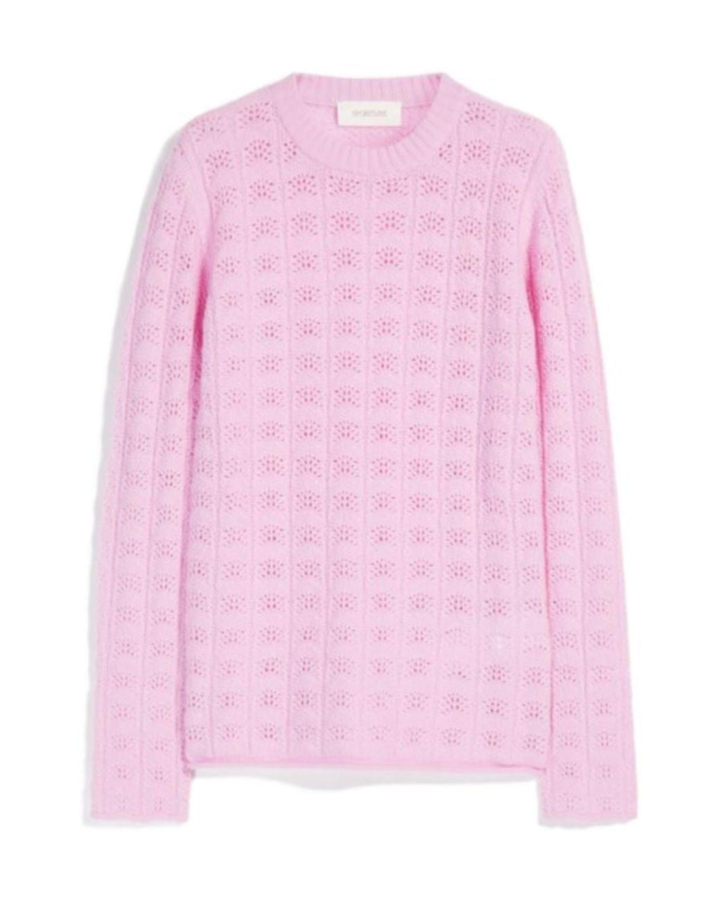 Geometric design of decorative stitch perforation. With extra long sleeves and a round collar with rib inserts. Colour: pink