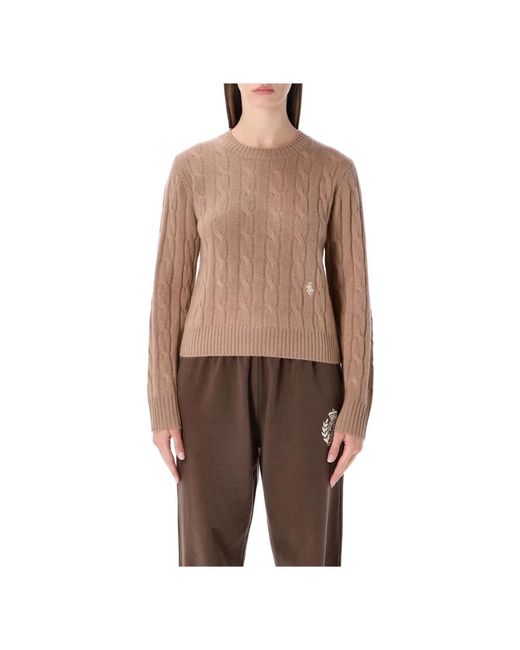 Sporty & Rich SRC Cableknit Sweater combines a soft cashmere-and-wool blend with a classic cable-knit design for elevated everyday layering. It offers refined casualwear with a cropped silhouette and embroidered logo. Key attributes: Brown | Camel | Cashmere and wool | Cable-knit pattern | Crew neck | Long sleeves | Embroidered front logo | Ribbed edges and cuffs | Dimensions & fit: Slightly cropped fit | Runs true to size | Model: Alessandra is 1,75 m and wears size S | Composition & care: 70% cashmere | 30% wool | Hand wash, dry flat.