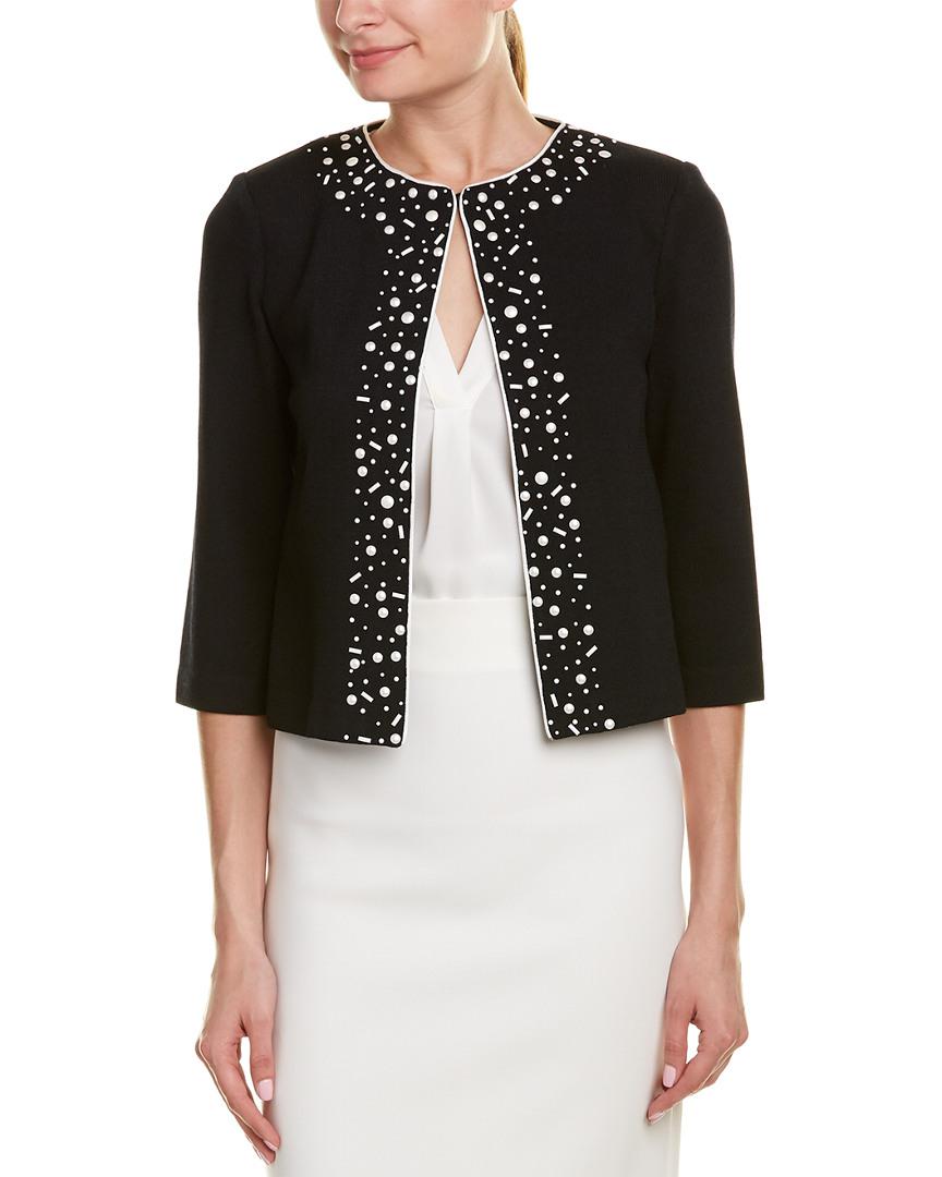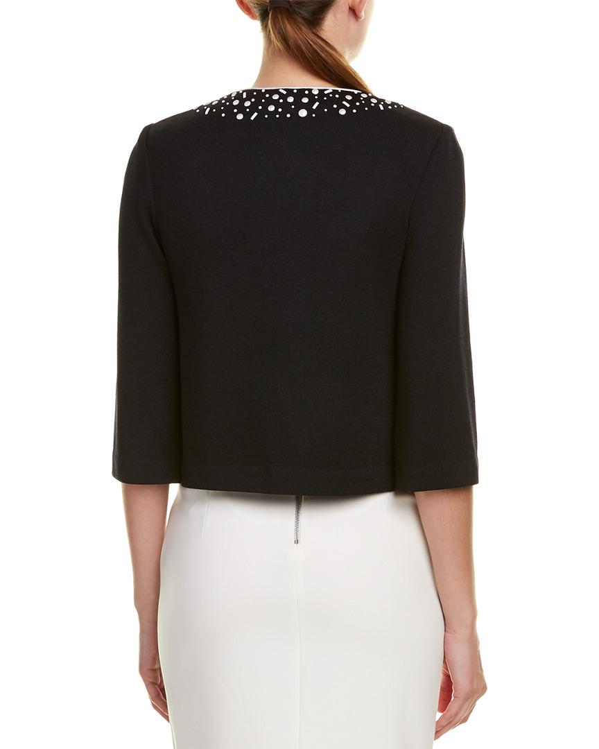 Color/pattern: black/bright white. Approximately 19in from shoulder to hem. Measurement was taken from a size 2 and may vary slightly by size. Design details: 3/4-length sleeves, bead embellishments. Hook-and-eye-closure. 72% wool, 28% rayon. Dry clean only.
