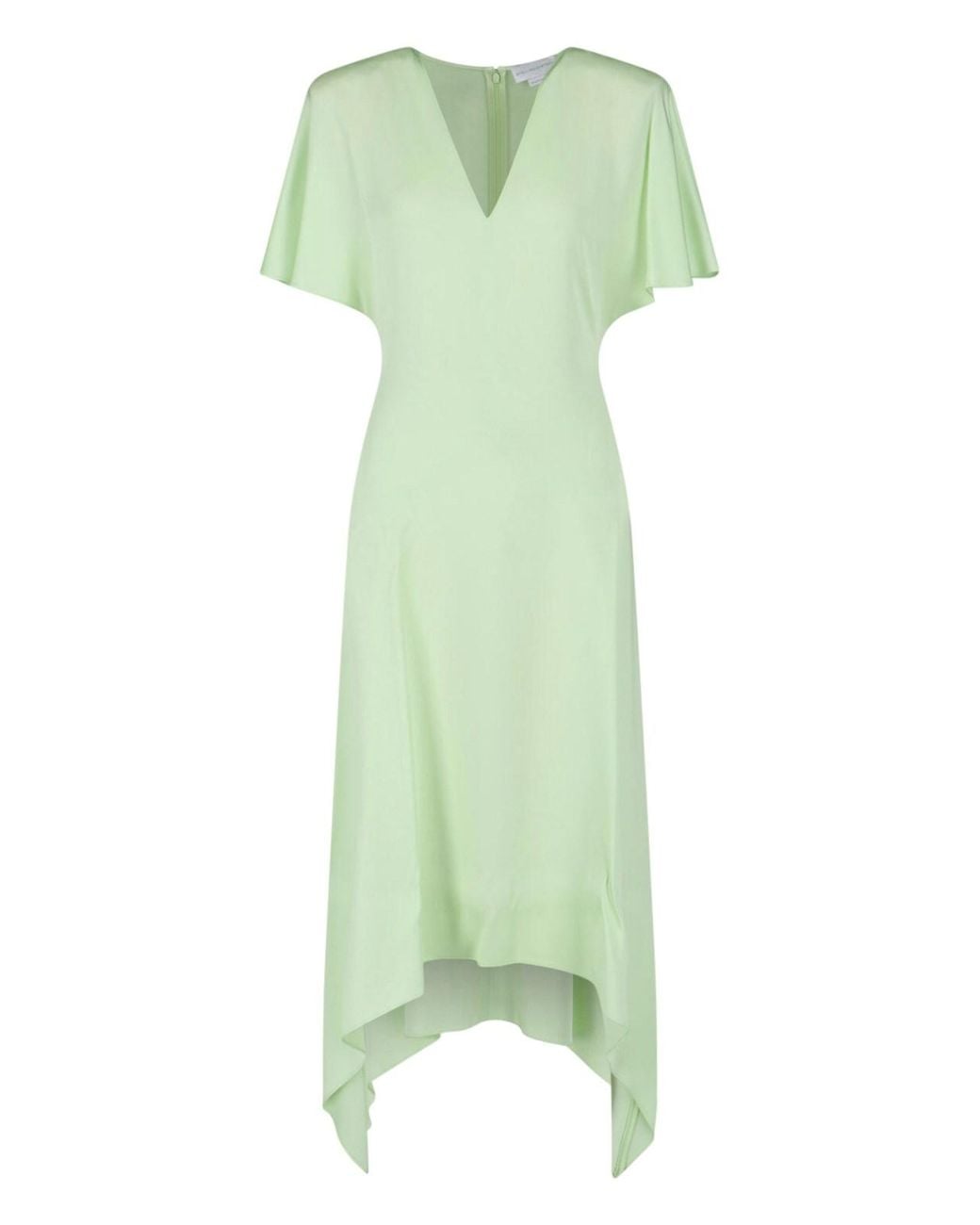 Stella McCartney midi dress in green viscose blend satin, V-neck, short sleeves, back zip closure, asymmetric hem.