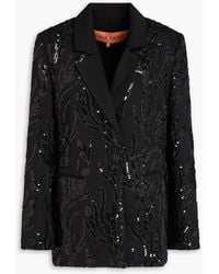 Go to FARFETCHCharcoal grey interlock twill weave mélange effect panelled design front button fastening pinstripe pattern notched lapels shoulder pads long sleeves chest welt pocket dart detailing two front flap pockets American rear vent logo-jacquard