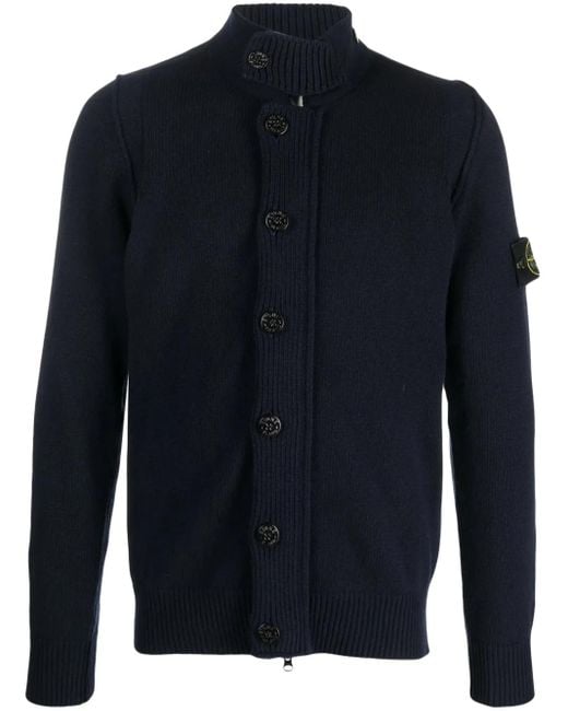 Navy blue wool blend knitted construction signature Compass motif stand-up collar front button fastening long sleeves ribbed cuffs and hem Size: S. Gender: Male. Material:Wool/Polyamide.