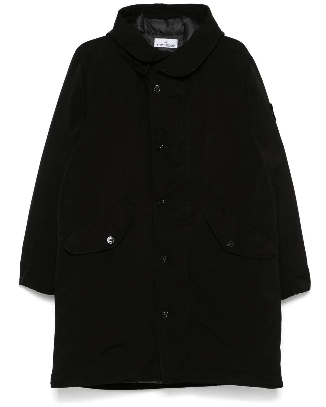 Black textured finish front press-stud fastening concealed front zip fastening padded design duck down blend filling classic hood long sleeves signature detachable Compass badge long sleeves ribbed cuffs two side flap pockets straight hem Size: M. Gender: Male. Material:Polyamide/Polyester/Polyester/Duck Down/Duck Feathers. Colour: black