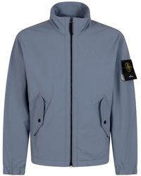 Go to TheDoubleFNavy blue stretch polyester canvas jacket by Stone Island, featuring front zip closure, stand collar, two slanted pockets with triangular flap and snap button, long sleeves with Compass logo badge, elasticated cuffs and hem, and double-slider zip closure. Colour: blue
