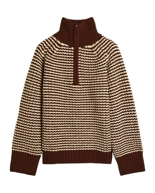 Info & Care Studio Nicholson wool jumper Striped intarsia, zip-fastening high-neck, raglan sleeves, ribbed trims Slips on 100% virgin wool Hand wash Size & Fit Length shoulder to hem: 27 inches/ 68.5cm Midweight Relaxed fit Model is 6'1""/ 185cm, chest size 38.5 inches and wears a size medium Colour: brown