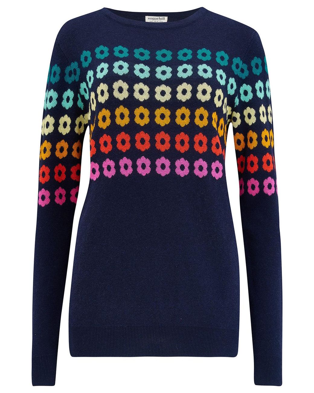 Meet your new go-to layer: the bestselling Rita Jumper is back – and cuter than ever. With its lightweight cotton-mix feel, comfy crew neck, and flattering mid-hip length, it’s made for throwing on and heading out. The real mood booster? That playful stripe of retro flowers in a dreamy gradient from teal to hot pink, all set on a navy base. It’s fun, bold, and totally wearable – basically, a colourful knit that does all the talking. The perfect pick-me-up for your wardrobe! Machine Washable (Delicate) Cotton 57%, Viscose 43%