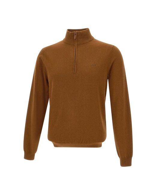 Sun 68 Half Zip Jumper is a tobacco-coloured knit from the Everyday Collection, designed for easy layering and everyday casual wear. It features a stand-up collar with a half-zip closure for adjustable coverage. Key attributes: Brown | Tobacco | Merino wool and cotton | Half-zip closure | Stand-up collar | Ribbed edges | Long sleeves | Stand-up collar with half-zip | Ribbed edges | Embroidered logo on chest | Long sleeves | Dimensions & fit: Regular fit | Ideal for casual wear | Composition & care: Merino wool | Cotton Colour: brown