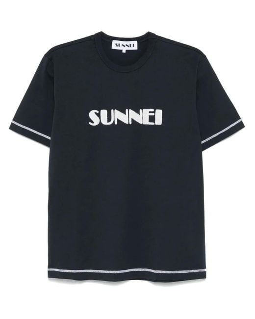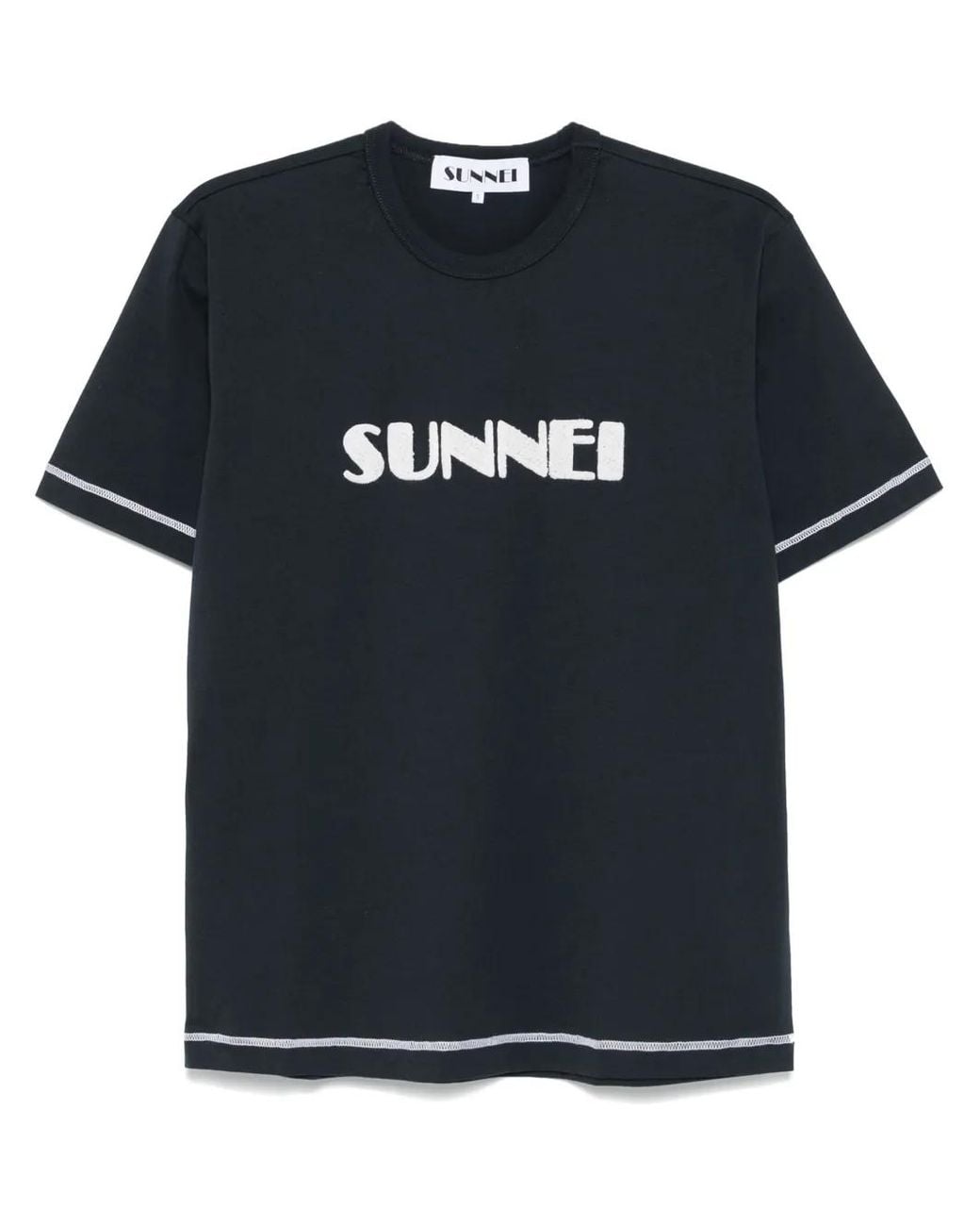 Navy blue organic cotton jersey texture flocked logo crew neck short sleeves seam detailing short sleeves straight hem When buying this unisex item, keep in mind that it is graded in standard men's sizing. Size: XS. Gender: Unisex. Material:Organic Cotton. Colour: black