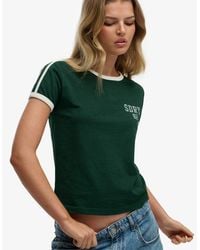 Go to SuperdrySlim fit - designed to fit closer to the body for a more tailored look Short sleeves Contrast colour stripes on shoulders Ringer collar and cuff design Printed text across chest Small signature