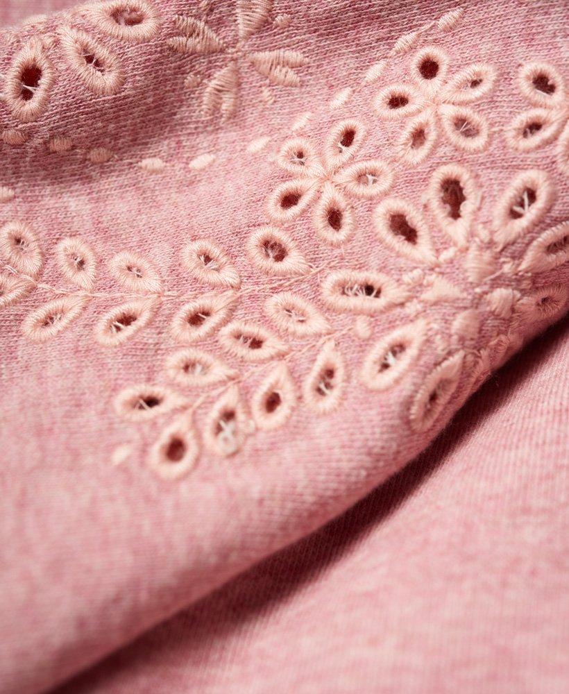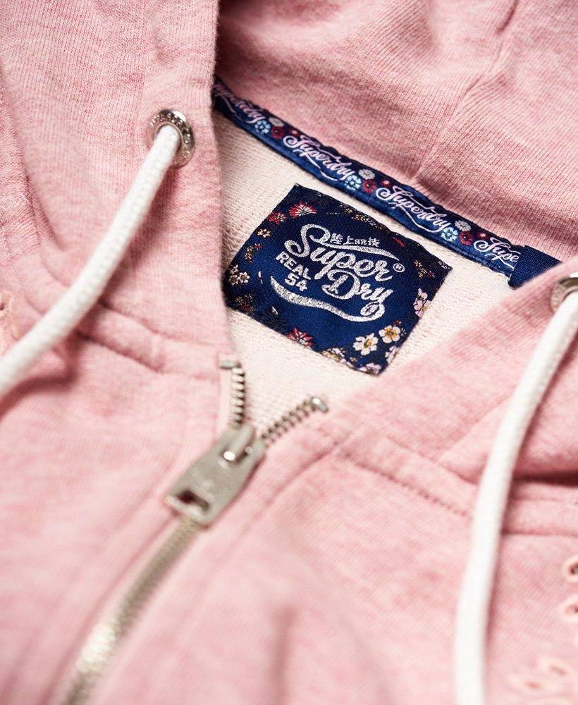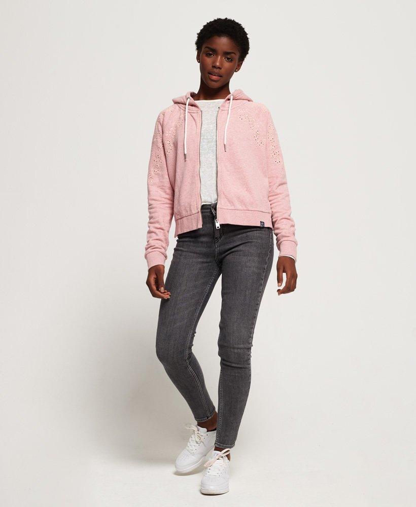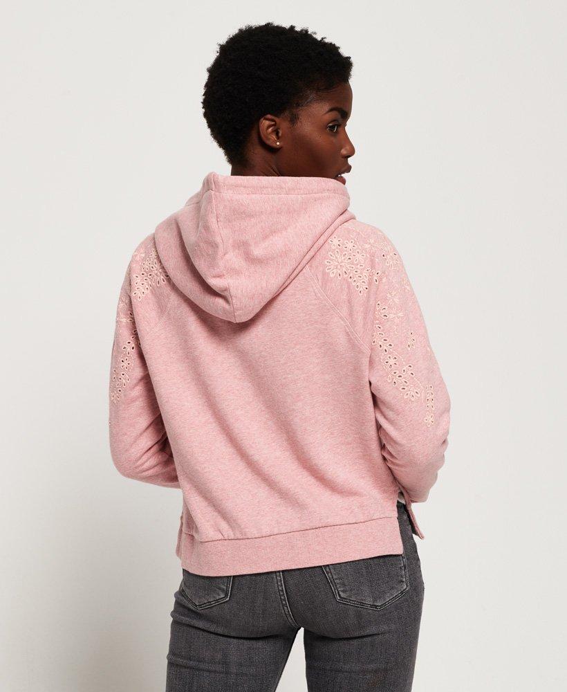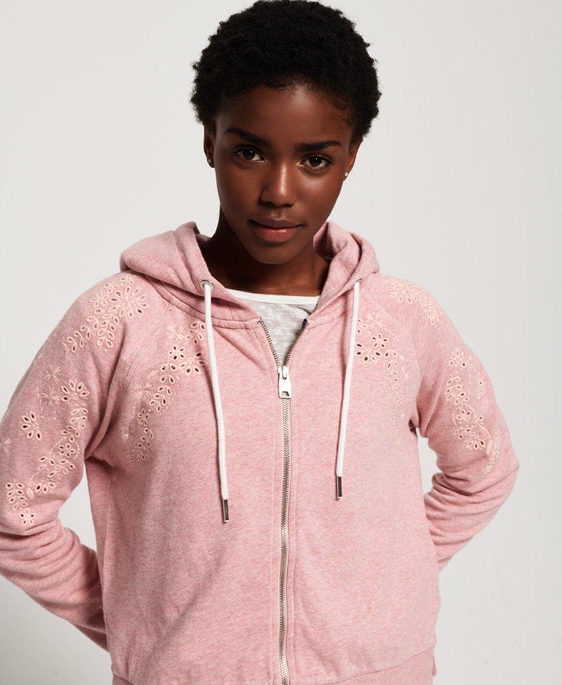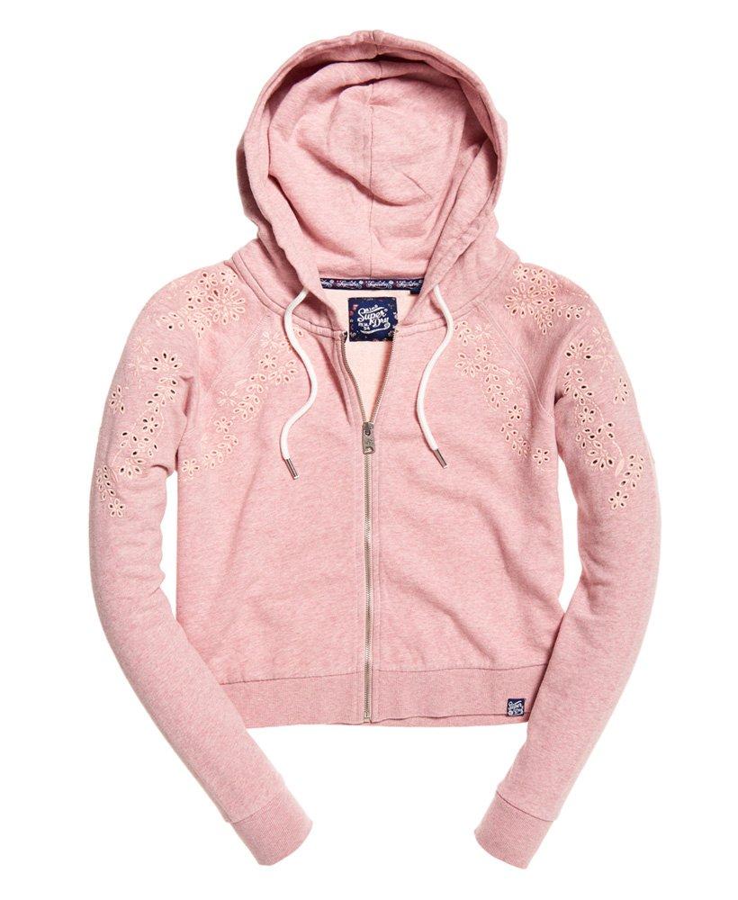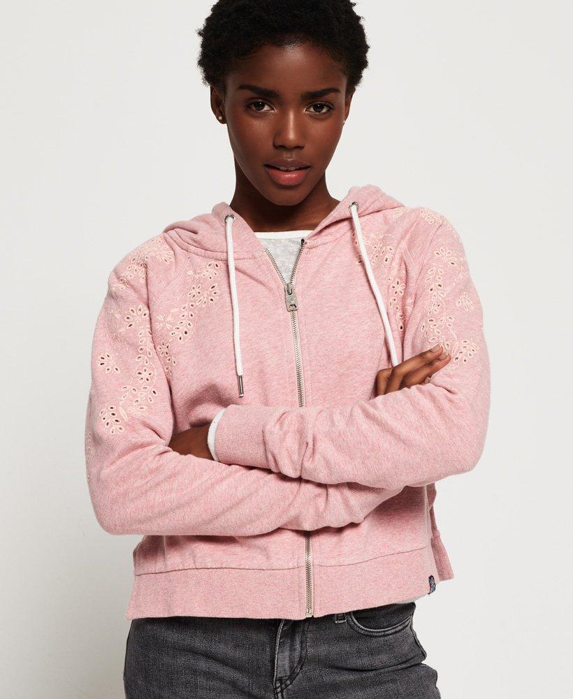 Superdry women's Ivy Broidery zip hoodie. This feminine take on the classic zip hoodie features a zip fastening, a drawstring adjustable hood and a ribbed hem and cuffs. The Ivy Broidery zip hoodie also features broderie anglaise on the shoulders, split side seams and Superdry logo tab on the hem. Colour: pink