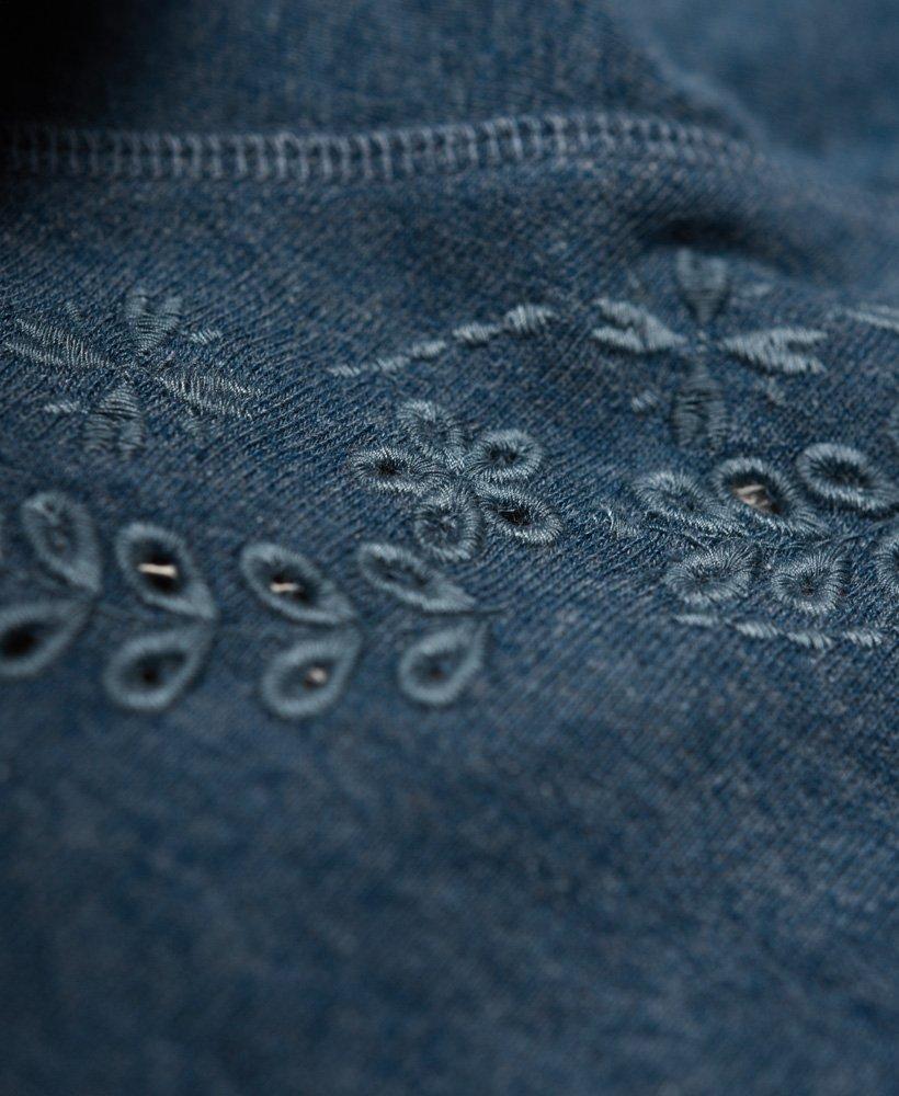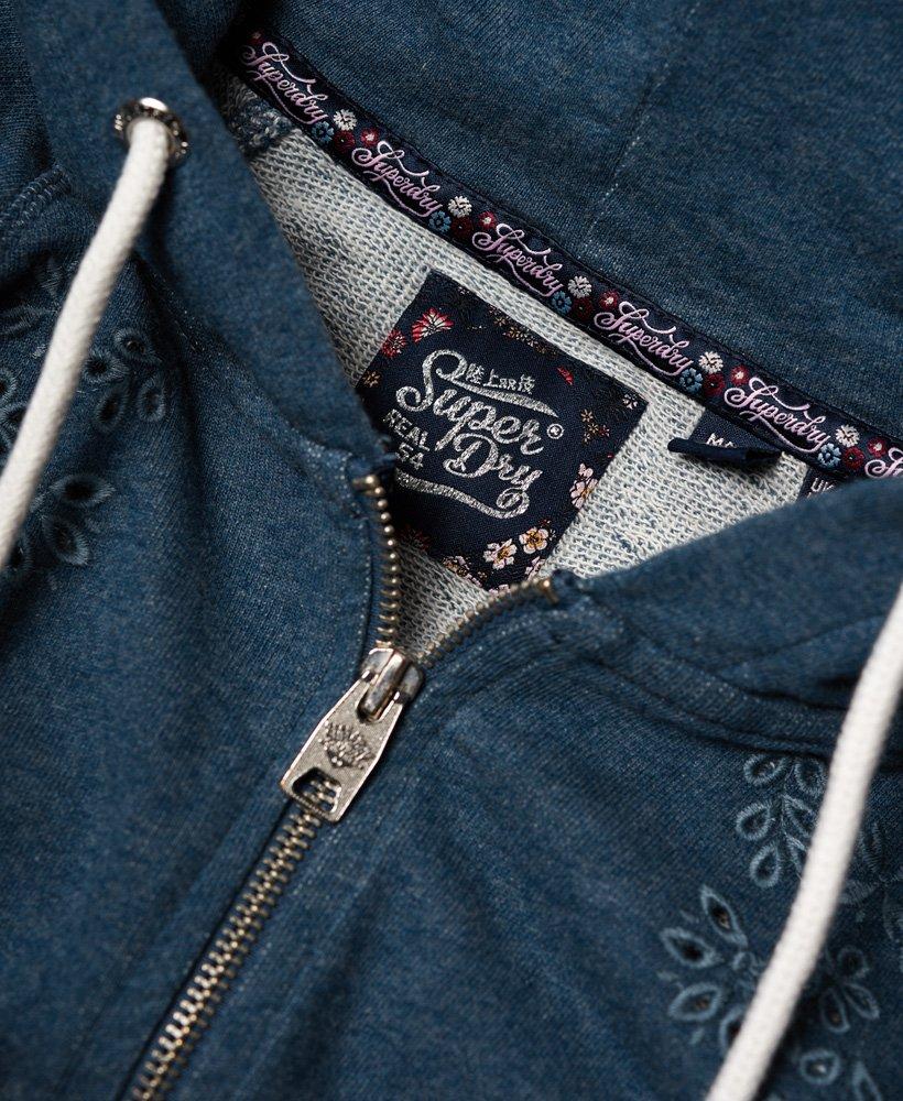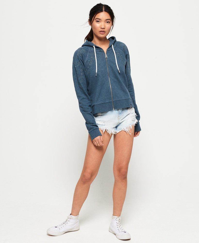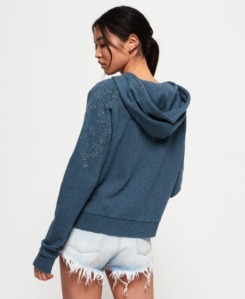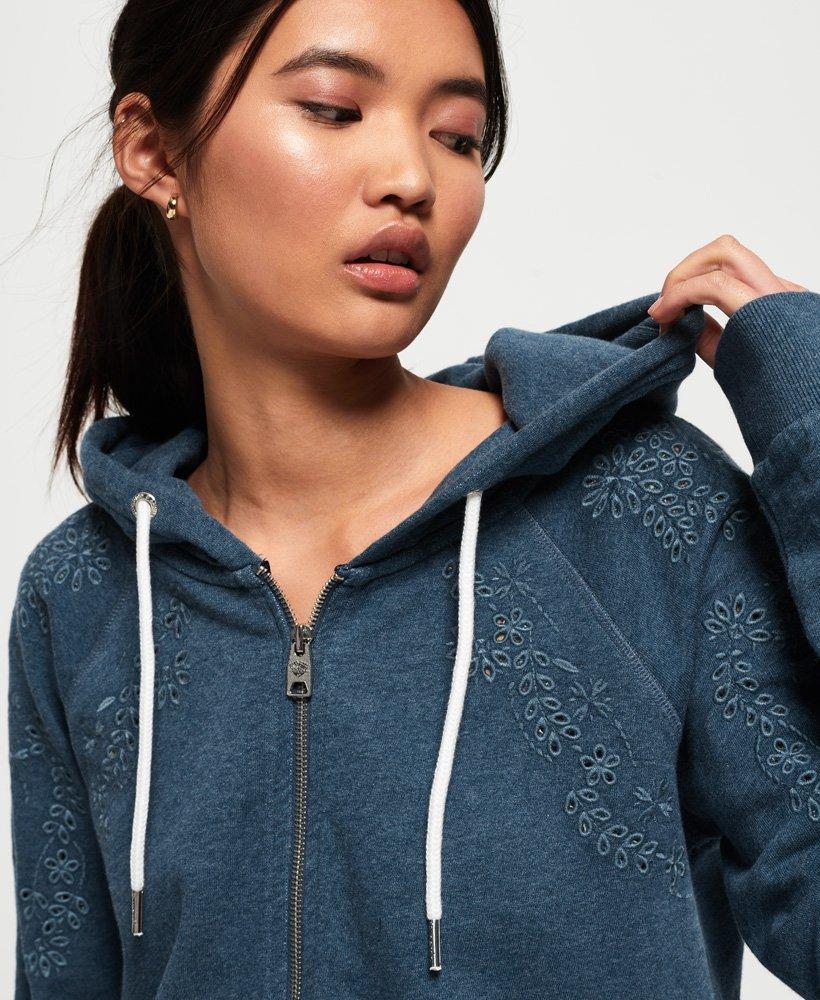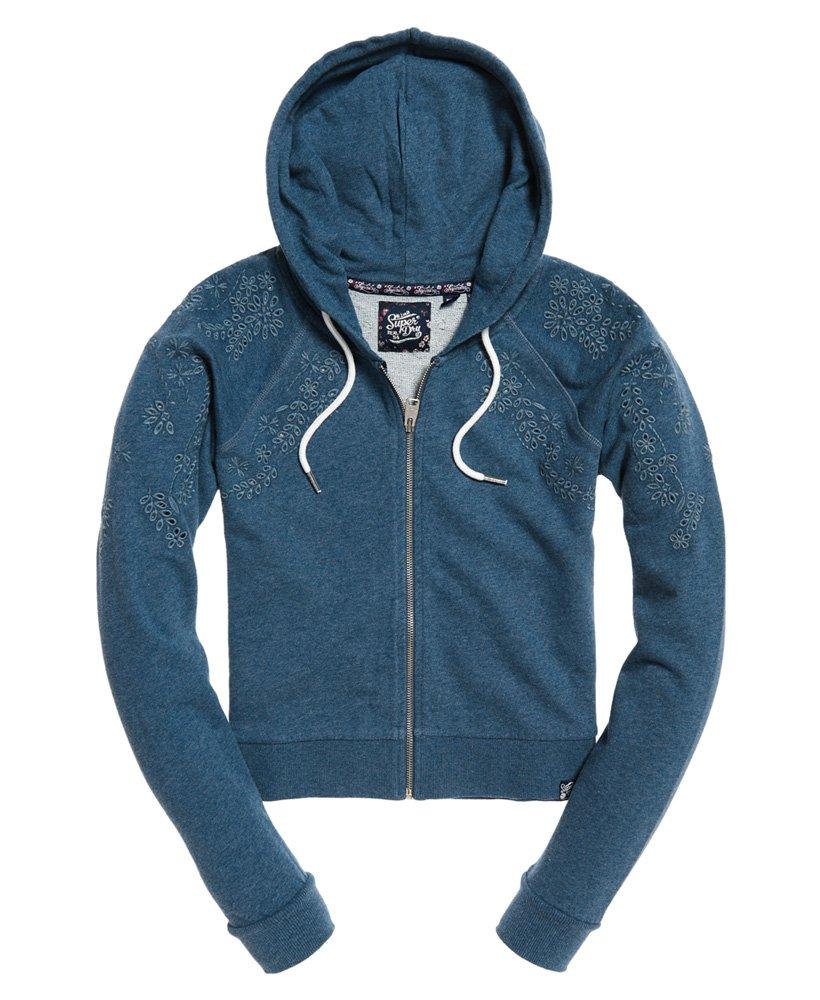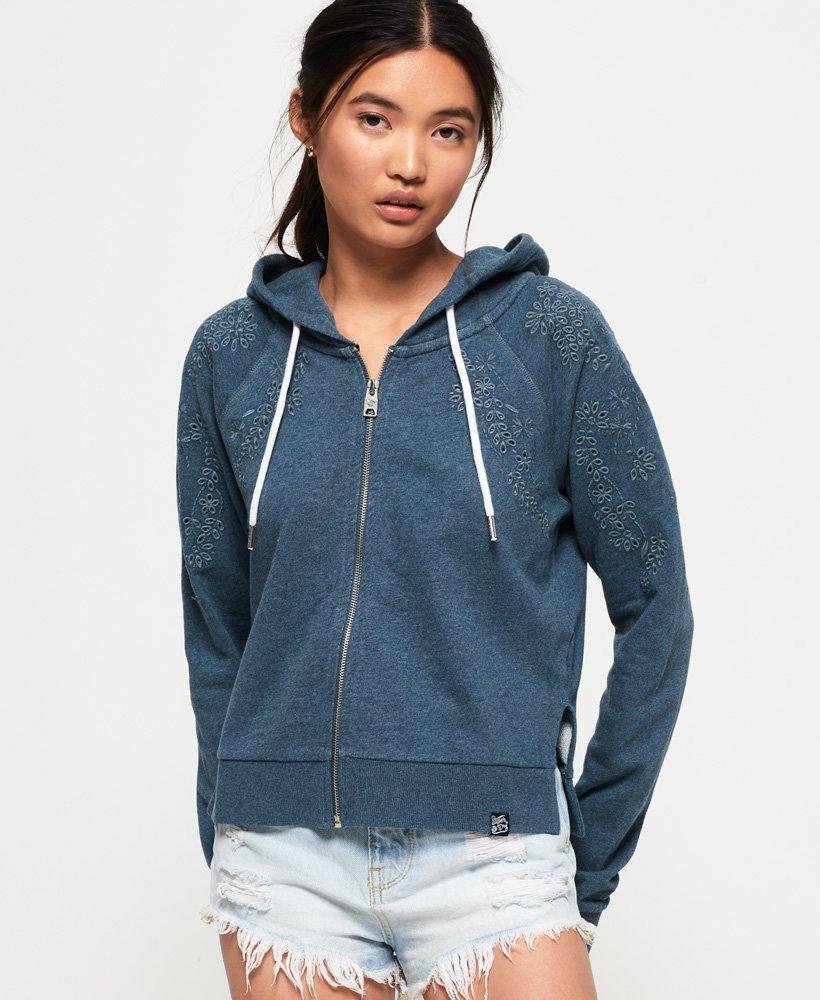 Superdry women's Ivy Broidery zip hoodie. This feminine take on the classic zip hoodie features a zip fastening, a drawstring adjustable hood and a ribbed hem and cuffs. The Ivy Broidery zip hoodie also features broderie anglaise on the shoulders, split side seams and Superdry logo tab on the hem. Colour: blue