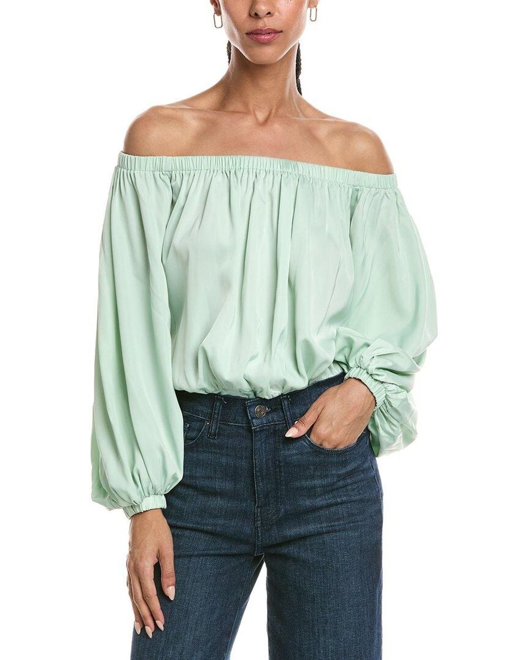 Color/pattern: mint chip Approximately 32in from shoulder to hem Design details: elasticized off-the-shoulder neckline and balloon sleeves Gusset snap closure Self: 100% polyester Contrast: 90% nylon, 10% spandex Machine wash Made in the USA