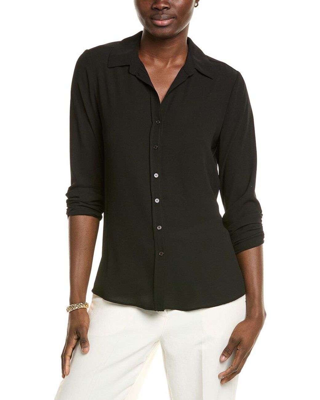 Color/pattern: white star Approximately 27in from shoulder to hem Model is 5'10 and is wearing a size small. Measurements may vary slightly by size. Design details: spread collar and ruched 3/4-length sleeves Button front 100% polyester Machine wash Imported Choose from the following: Black White Star Navy