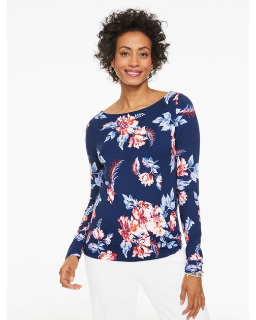 Our staple bateau neck top in a gorgeous foliage blooms print. Crafted from our famous easy-care, easy-wear effortless jersey fabric. Perfectly packable–just right for work and travel. Rayon/Spandex. Colour: blue
