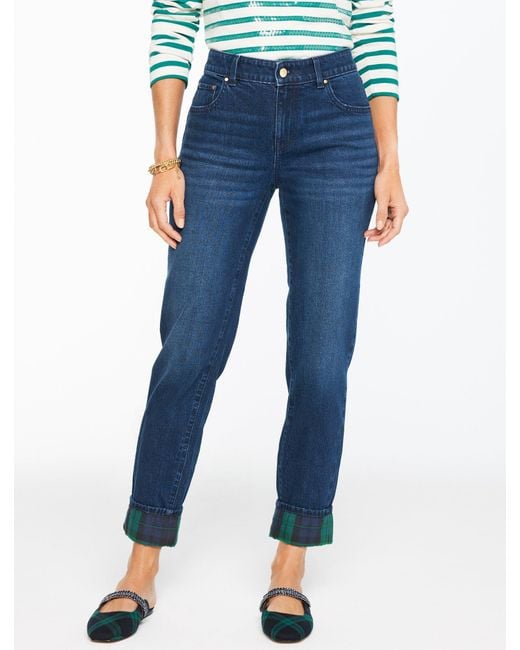 A season-ready Black Watch tartan pattern at the cuffs accents our Everyday Relaxed Jeans. In a straight leg silhouette. Crafted with a hint of stretch and five-pocket styling. A casual-chic update for your denim wardrobe. Colour: blue