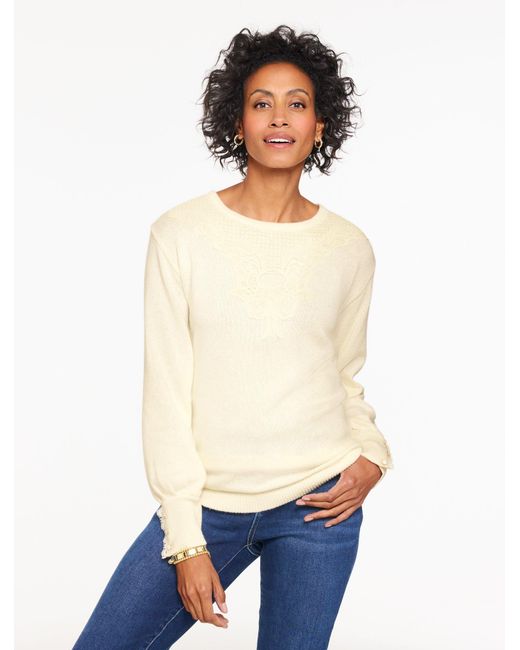 Delicate floral lace the yoke of this oh-so-soft crewneck jumper. Crafted from a soft cotton blend with chic buttons at the sleeve cuffs. Cotton/Nylon/Acrylic. Colour: white