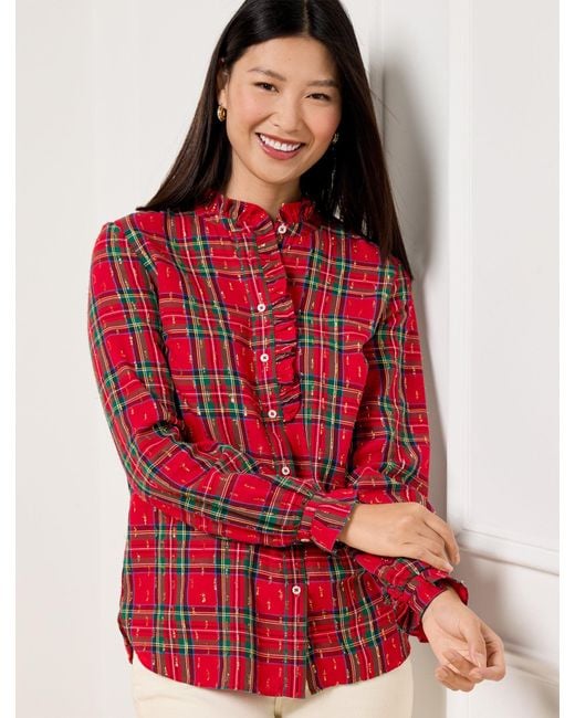 Wonderfully detailed. Simply effortless. Our easy-to-style button front top shimmers with a hint of metallic. Detailed with pretty ruffles at the neck, placket and sleeve cuffs. In a solstice plaid pattern. An elevated classic. Cotton/Metallic. Colour: red