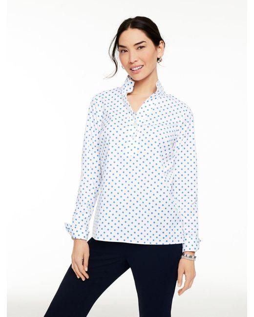 Our oh-so-feminine popover top in a lovey dot print with a chic stand collar. Relaxed silhouette. Easy care, wrinkle-free fabric retains a crisp look from AM to PM. Always pristine and just right for work, travel and every day. Cotton/Spandex. Colour: white