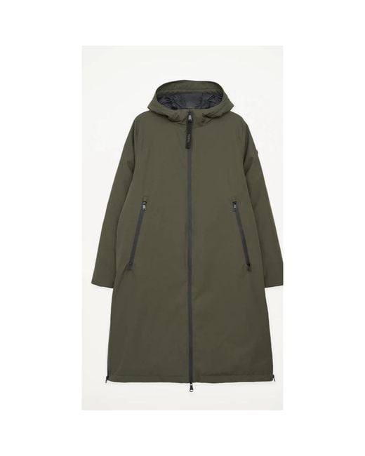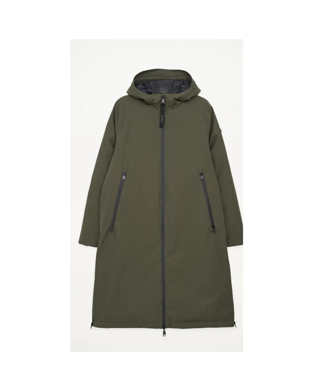 Stay stylish no matter the weather with the Tantä Rain Jacket. Made from polyester twill fabric and padded with a breathable, feather-free insulating layer, the Cher jacket features a long A-line silhouette with all seams sealed for superior protection. It has long waterproof double-slider zippered pockets, closes with a waterproof zipper, and is finished with interior backpack straps for hands-free carrying. Customize the fit with an adjustable drawstring waist at the back. Care instructions: For light-colored garments, do not store with dark-colored items. Machine wash inside out with tennis balls - Cold water (max 30 degrees) - Delicate cycle - Gentle spin, do not tumble dry. Colour: green
