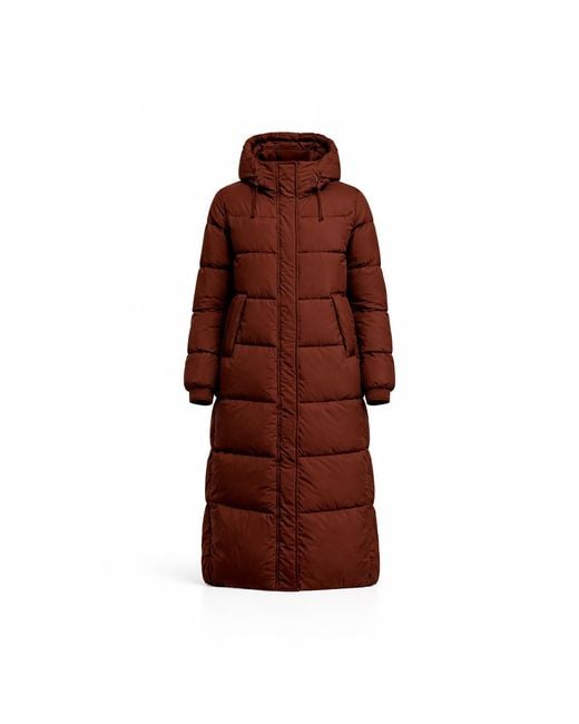 Women's Red Quilted Coat With Non-Detachable Hood, Side Pockets, And Zipper And Clip Closure